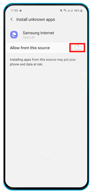 From a Home screen, swipe up or down from the center of the display to access the apps screen. Navigate: Settings. > Apps.> Tap Menu icon (upper-right).> Tap Special access.> Tap Install unknown apps.> Select the unknown app then tap the Allow from this source switch to turn on or off . Setting may vary little, depending upon different hanset.