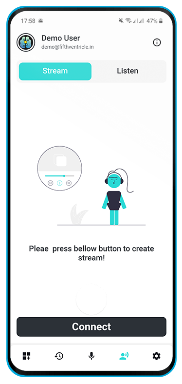 Open application Turn on your internet connection(wifi or mobile)>Make sure your internet speed is stable and up to mark(Minimum 500kb/s, Recommend 1mb/s)> Tap on boadcast icon(last second).> Tap on connect> Wait for confirmation>You are ready to start broadcasting sound.>share/copy your streaming code with your partner